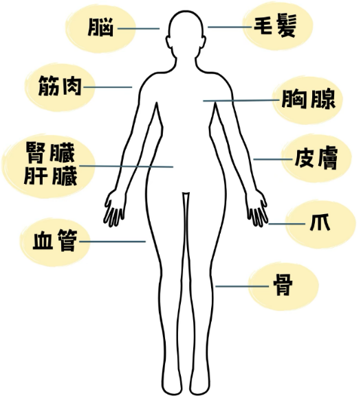 体内組織でケイ素が多いのはリンパ節、歯、肺、筋肉、腎臓、肝臓、脳、睾丸、血液などです。その他に毛髪、爪、骨、血管、皮膚など全身の組織に見られます。