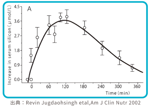 ケイ素を食品として摂取すると、120分以内に血清中のケイ素濃度が上昇し、その後3~9時間で尿中から排出されます。